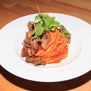 SPAGHETTI ARRABIATA CON STRACCETTI DI FILETTO DI MANZO